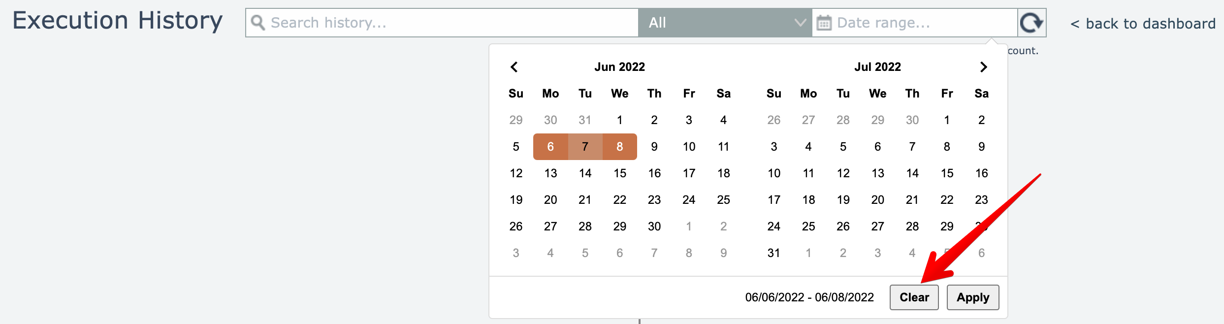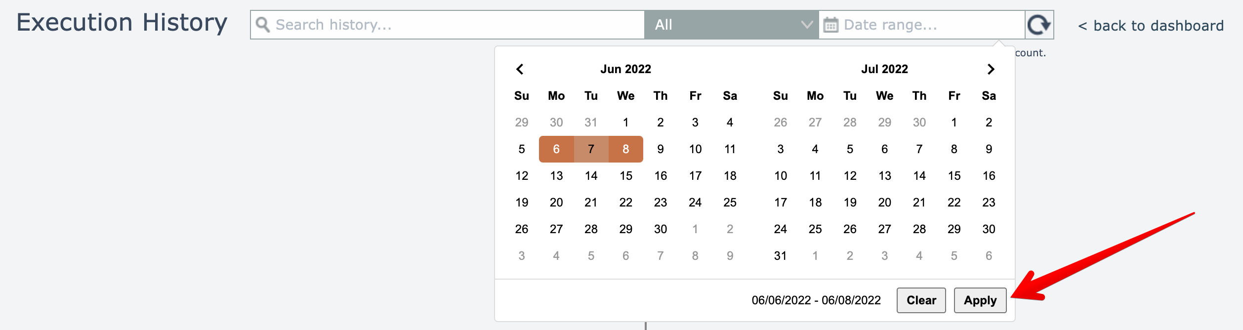Search results can be restricted to a date range by clicking the date range field and choosing a beginning and ending date: