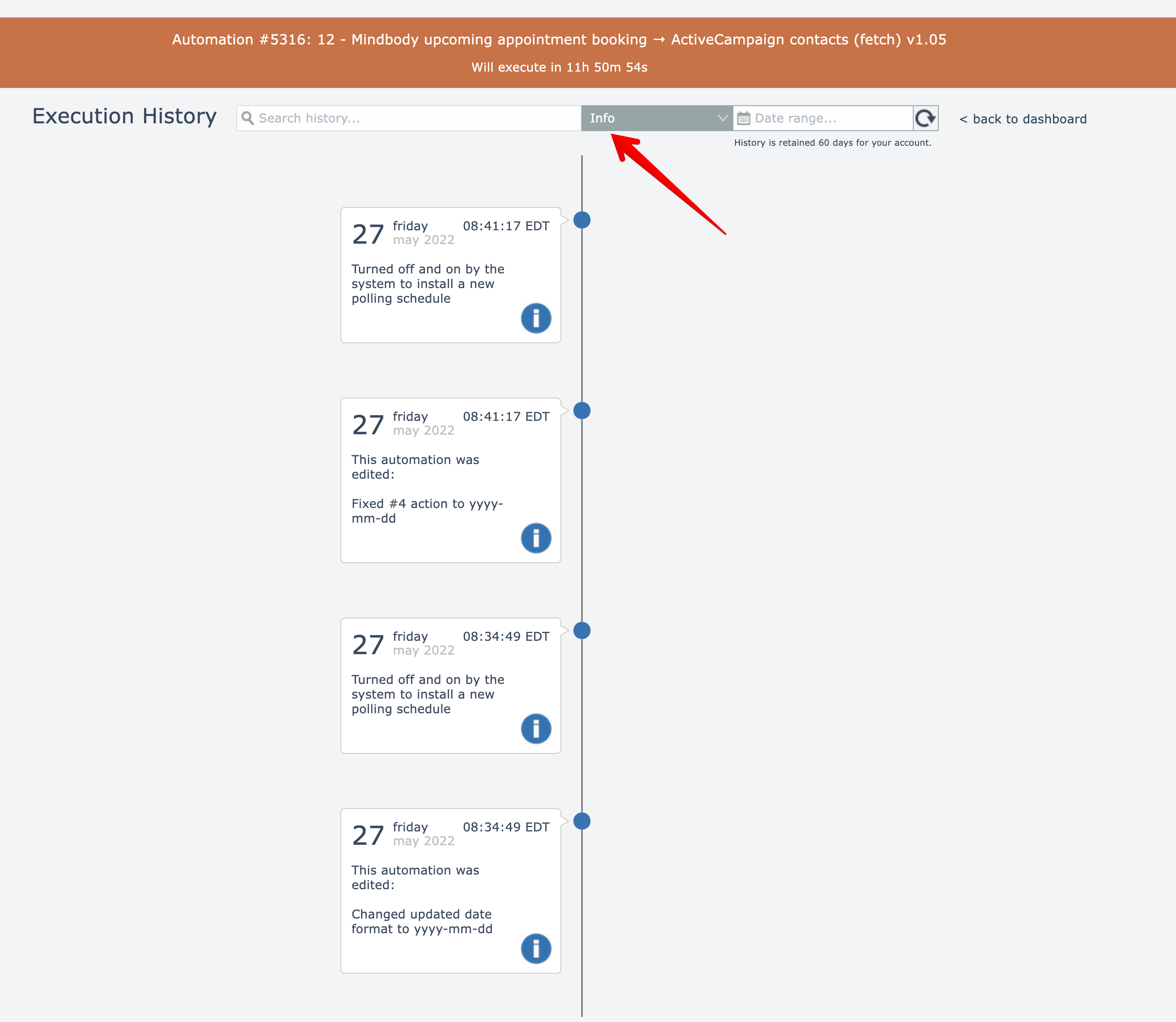 Info regards information messages written into the history. This includes version notes when the automation is edited and whenever the automation is turned on or off: