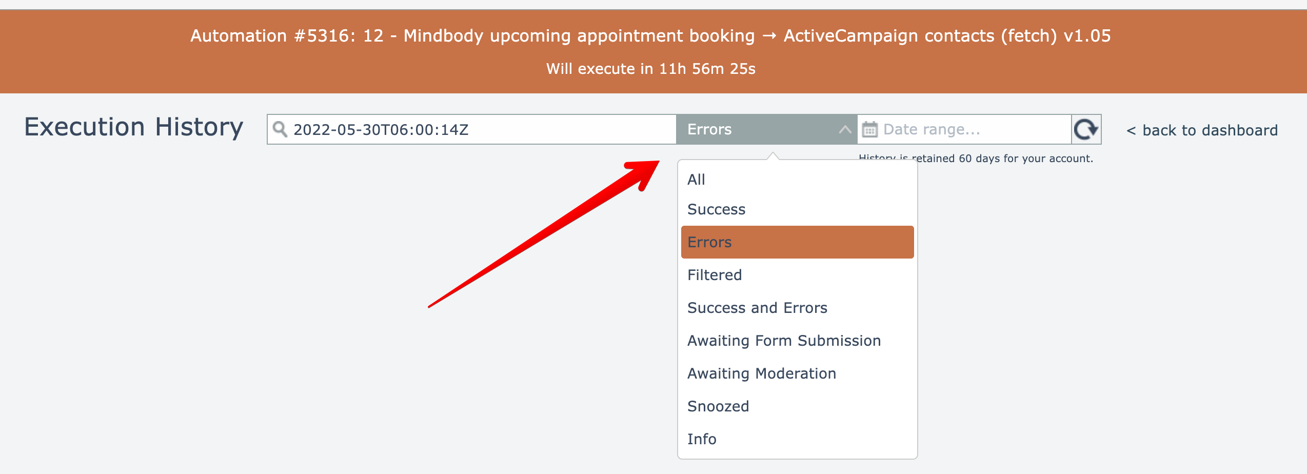 Learn how to effectively search the execution history of a system using search terms and advanced filters. Discover how to use AND/OR logic for search phrases and filter your results based on different criteria such as success/errors, awaiting form submis