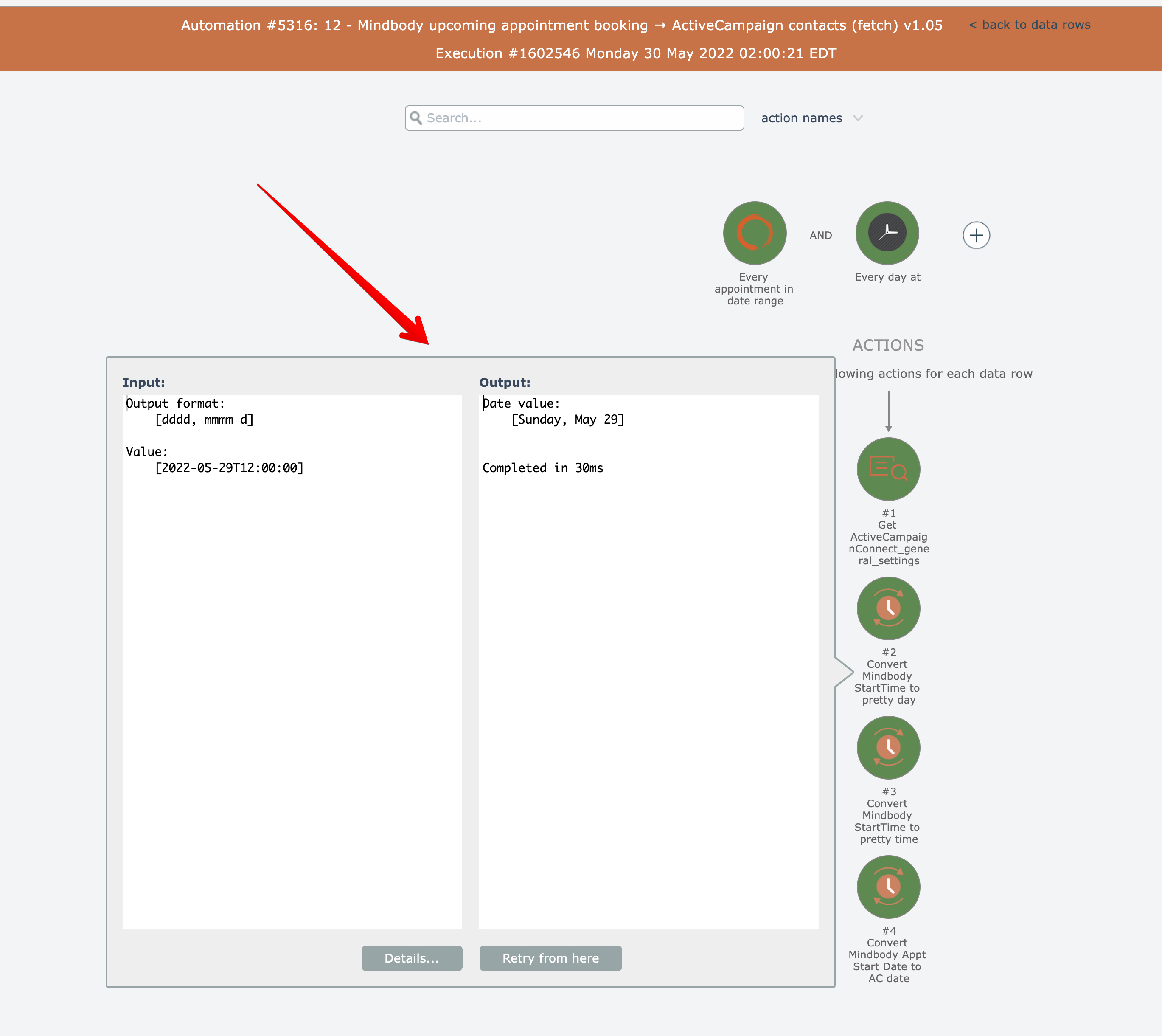 Each trigger and action can be moused over in the graphical history to view its input/output: