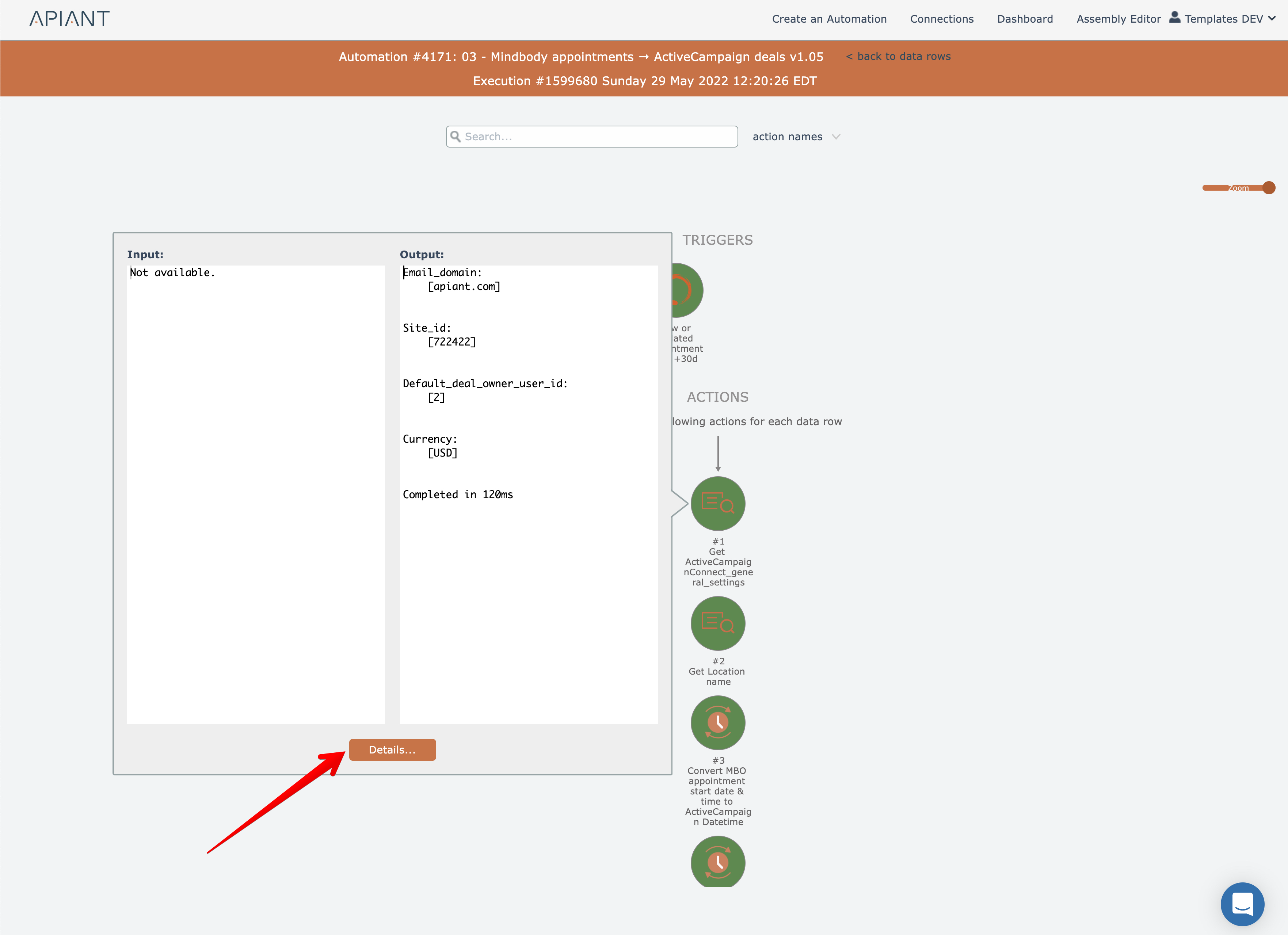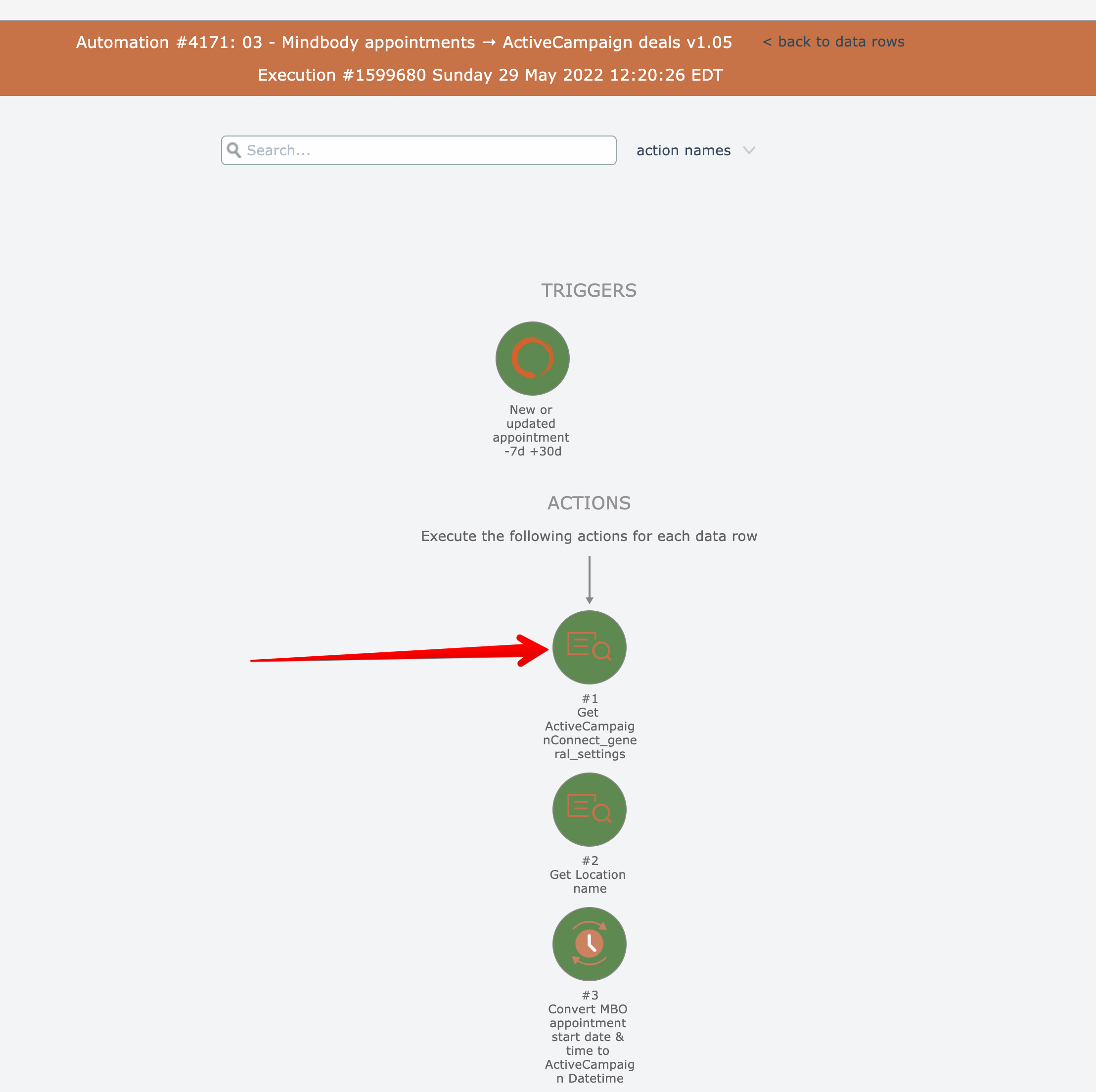 Triggers, actions, conditionals, and loops can be clicked to view their details in the graphical history view: