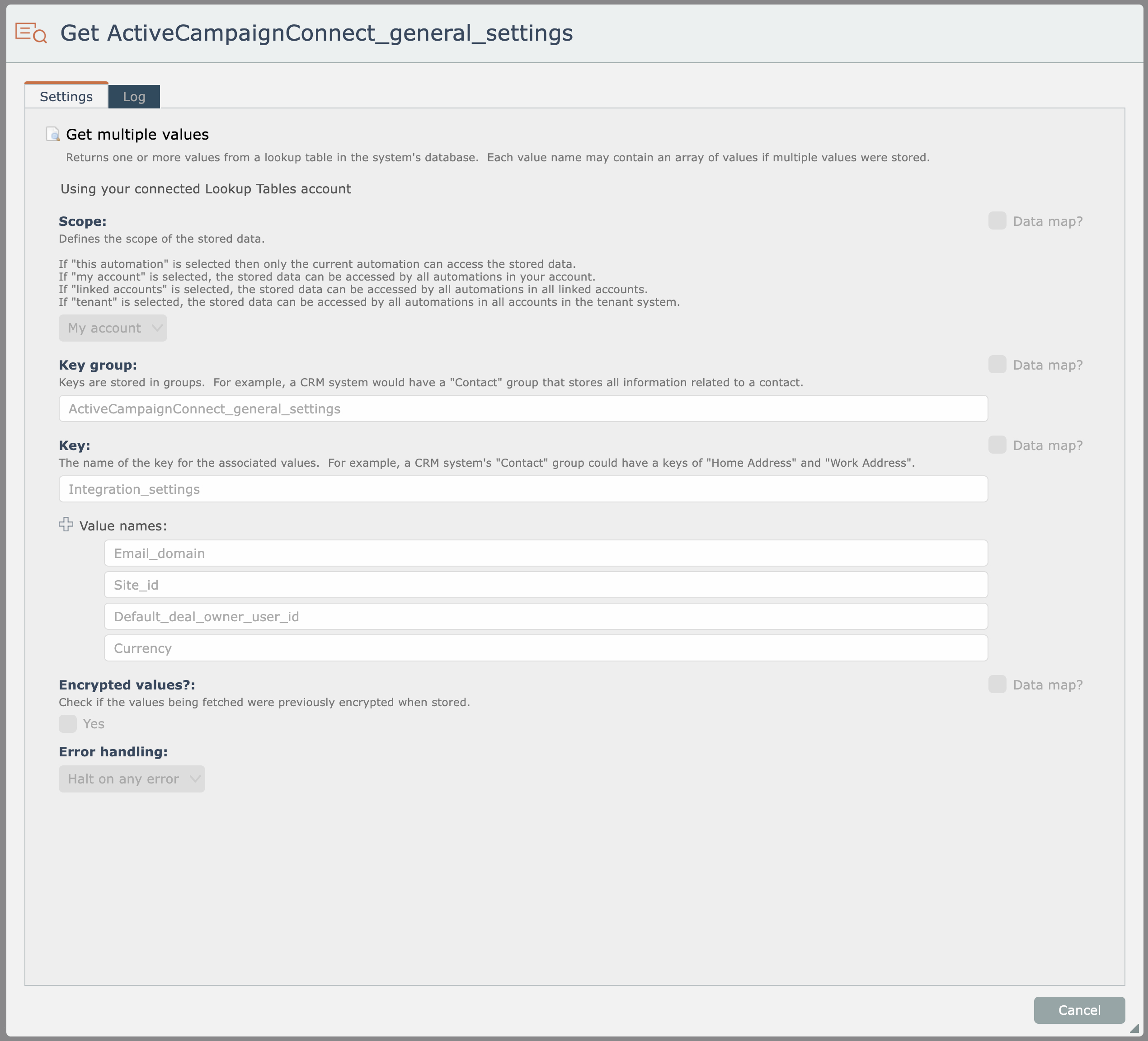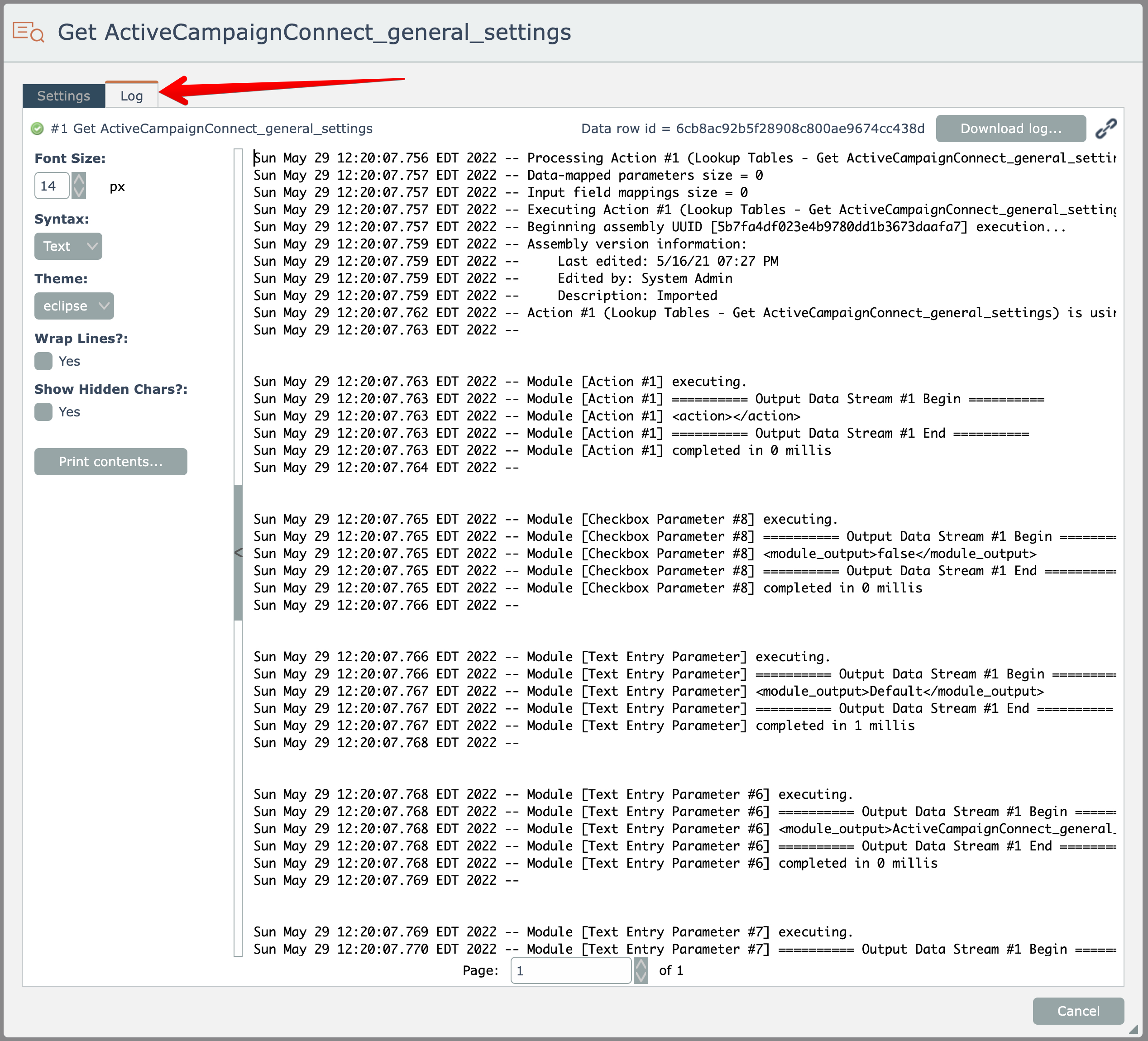 Select the Log tab to view the debug log for the item's execution (if available):