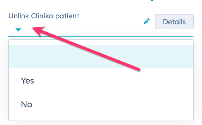 - Locate the property labeled "Unlink Cliniko patient".