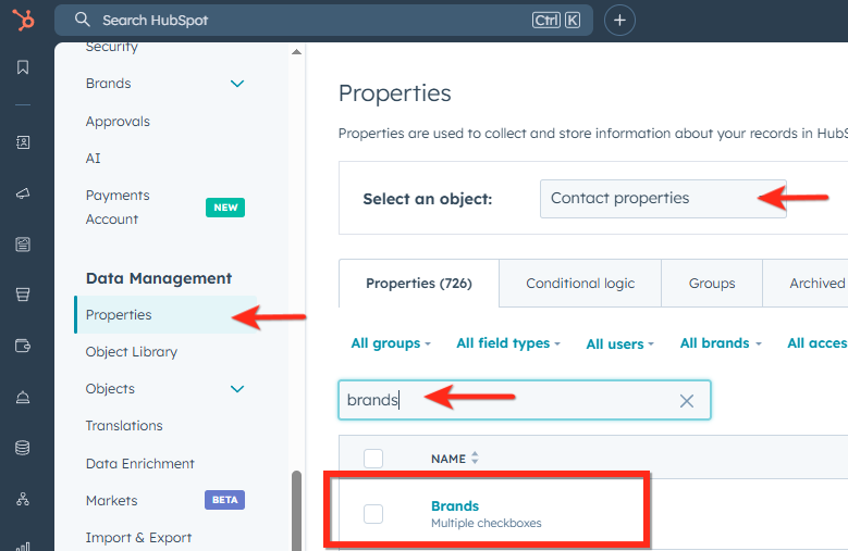- Search for the property named Brands.