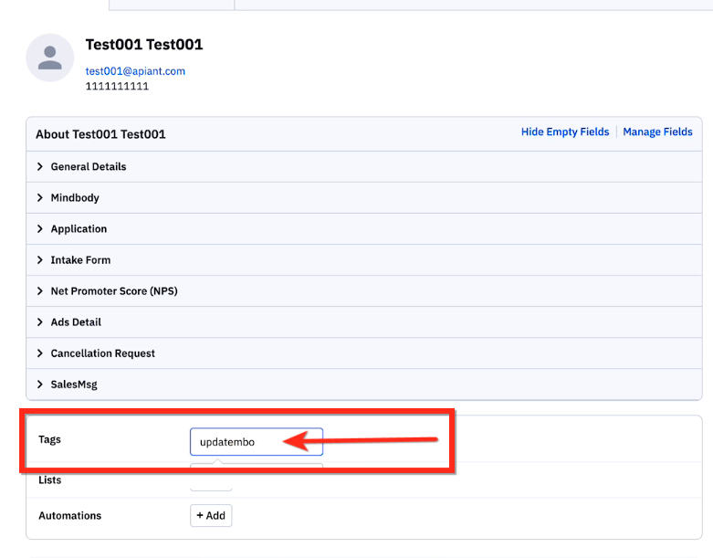 When a contact is added in ActiveCampaign — manually, via a form, or through a workflow — adding the updatembo tag triggers the sync to Mindbody.