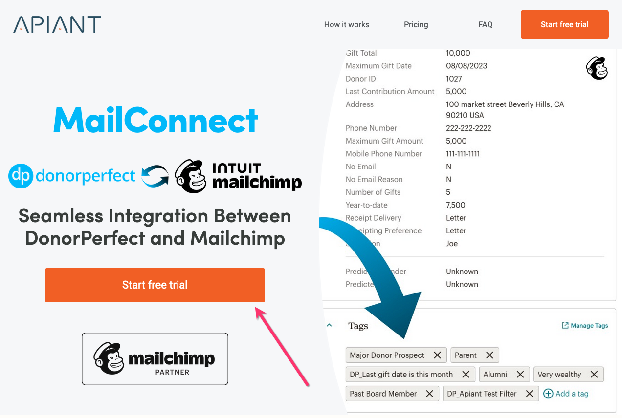 Increase donor engagement and fundraising with MailConnect, a tool that seamlessly integrates DonorPerfect and Mailchimp. Segment donor lists for targeted outreach, automate the syncing process, gain insights into donor behavior, and streamline event mana