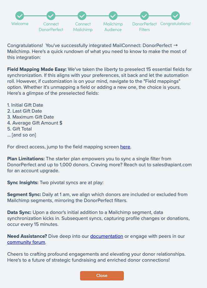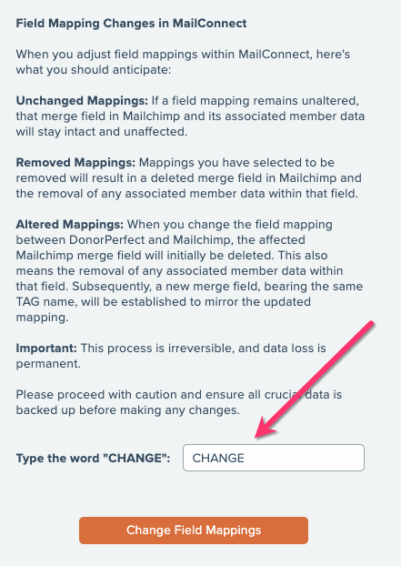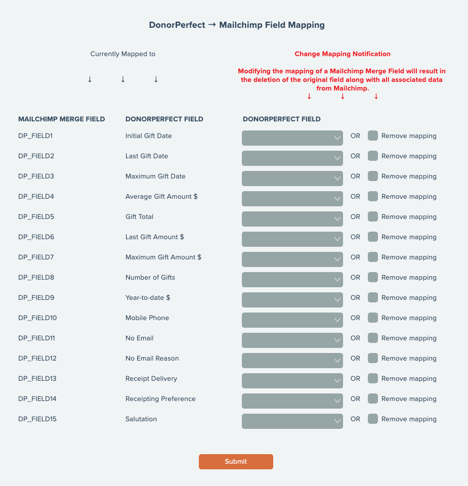 For instance, if you've been syncing a specific DonorPerfect field to a Mailchimp field for several months and then decide to change or remove that mapping, all the historical data in Mailchimp related to that mapping will be lost.