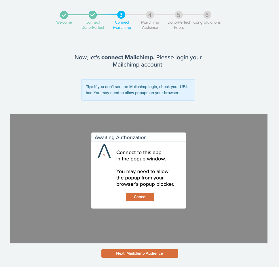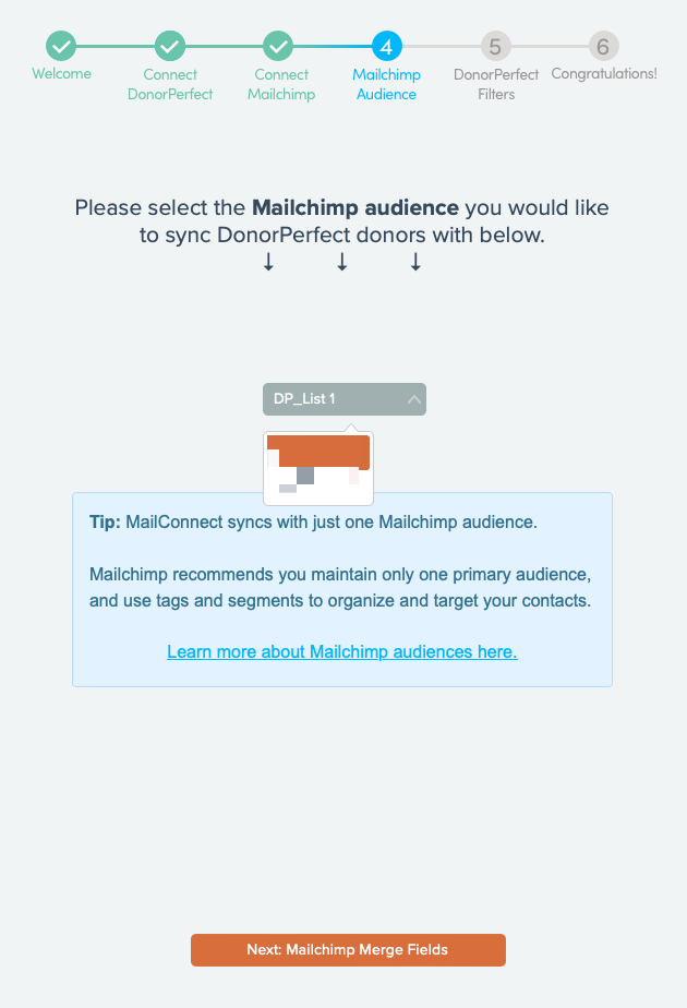 Account Setup: Step 4: Select the Mailchimp audience you want to sync DonorPerfect with