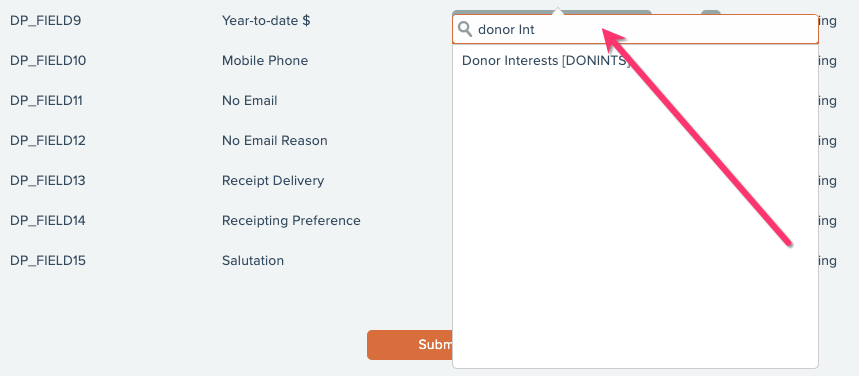 - Or you can search and select a new default or custom DonorPerfect field to sync with the designated Mailchimp merge field: