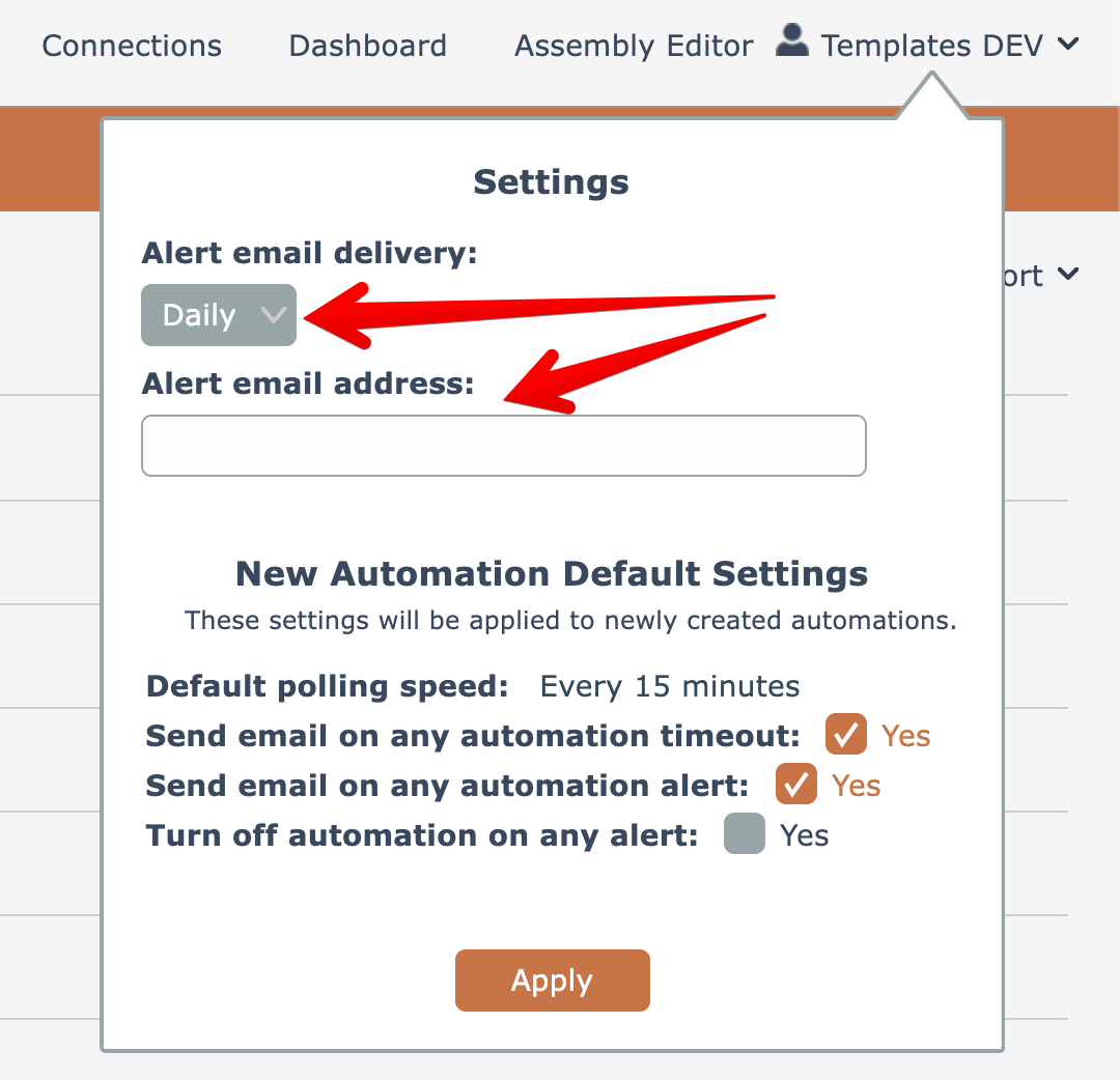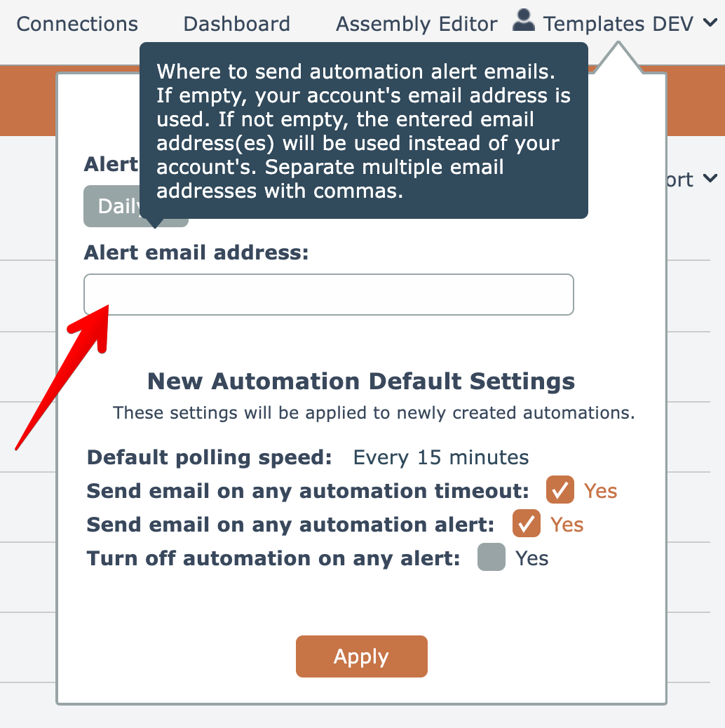 The default settings are to send a single alert report daily to the default email address in your APIANT account, as indicated by an empty alert email address field: