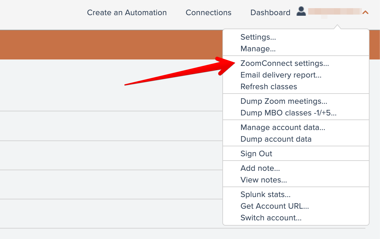 You can access your settings via your Account menu at the top right, by choosing the ZoomConnect Settings menu option here:
