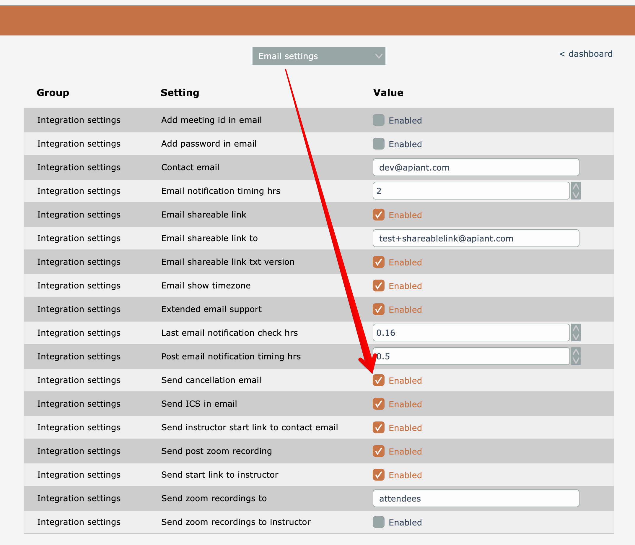 To control the sending of cancellation emails, configure the "Send cancellation email" setting: