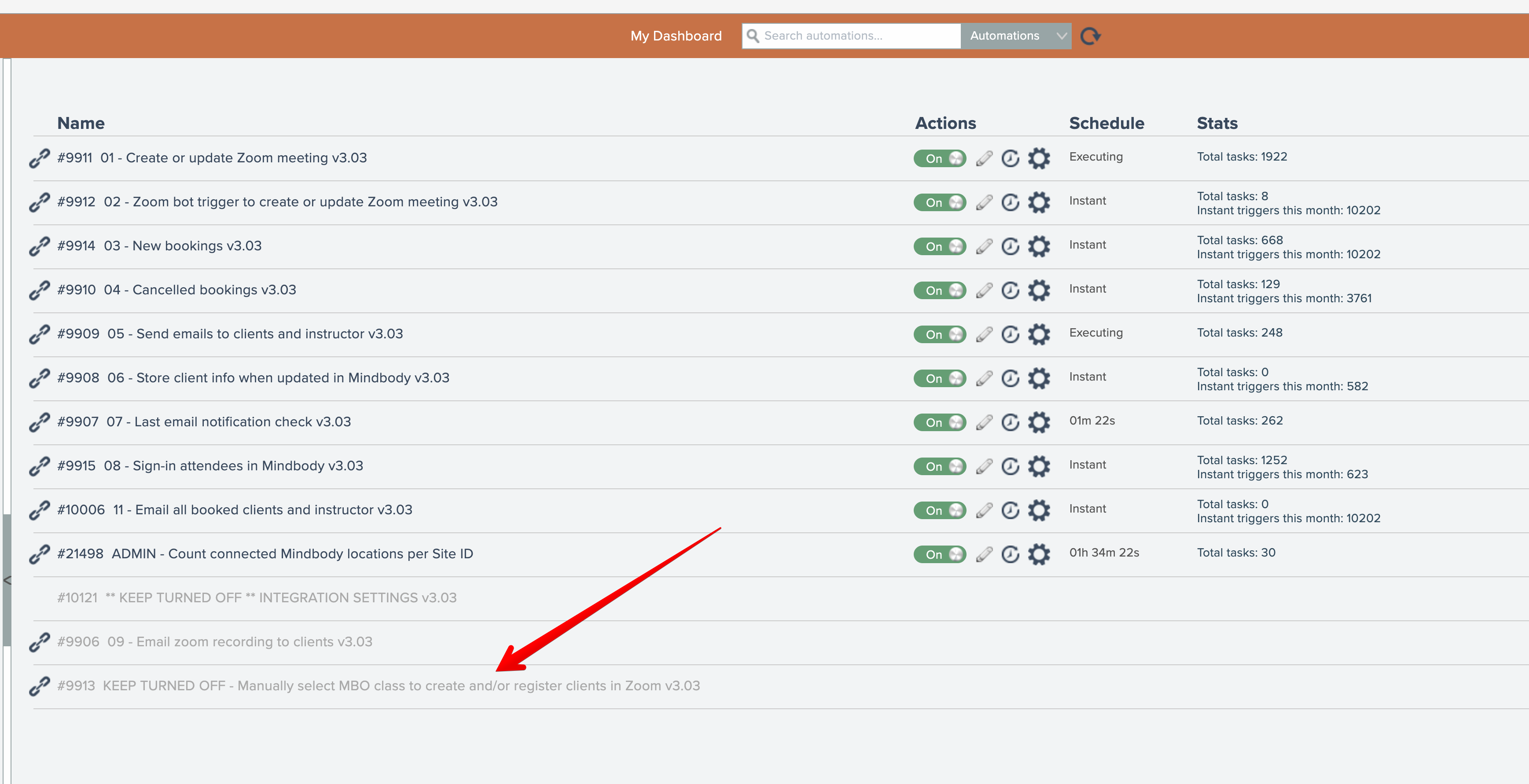 The automation is named "KEEP TURNED OFF - Manually select MBO class to create and/or register clients in Zoom"