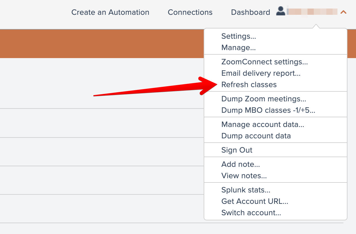 To force an immediate refresh of your Mindbody changes in Zoom, you can simply use the "Refresh Classes" menu option found under your account menu at the top right: