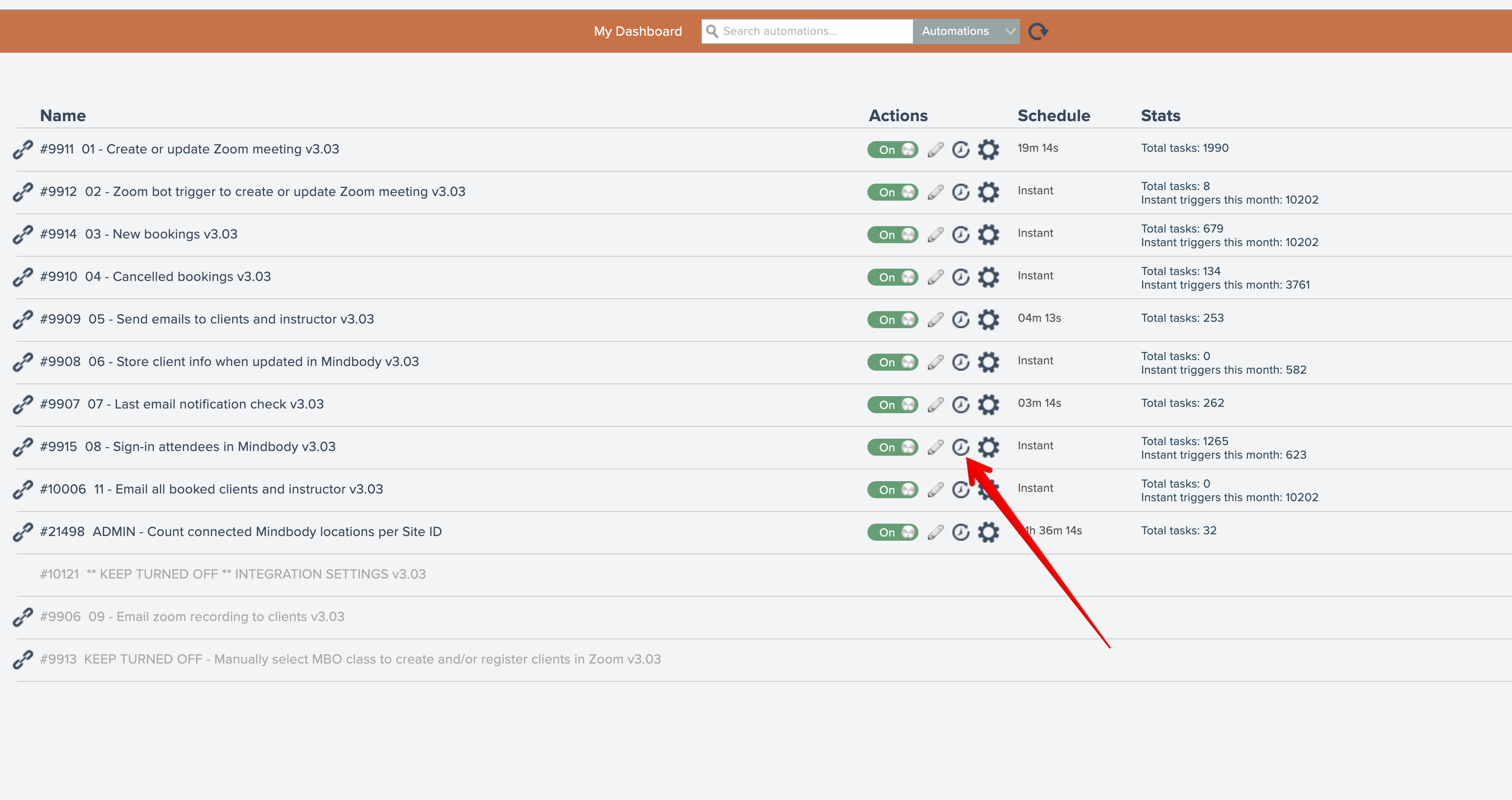 Click the History icon for automation "08 - sign-in attendees in Mindbody":