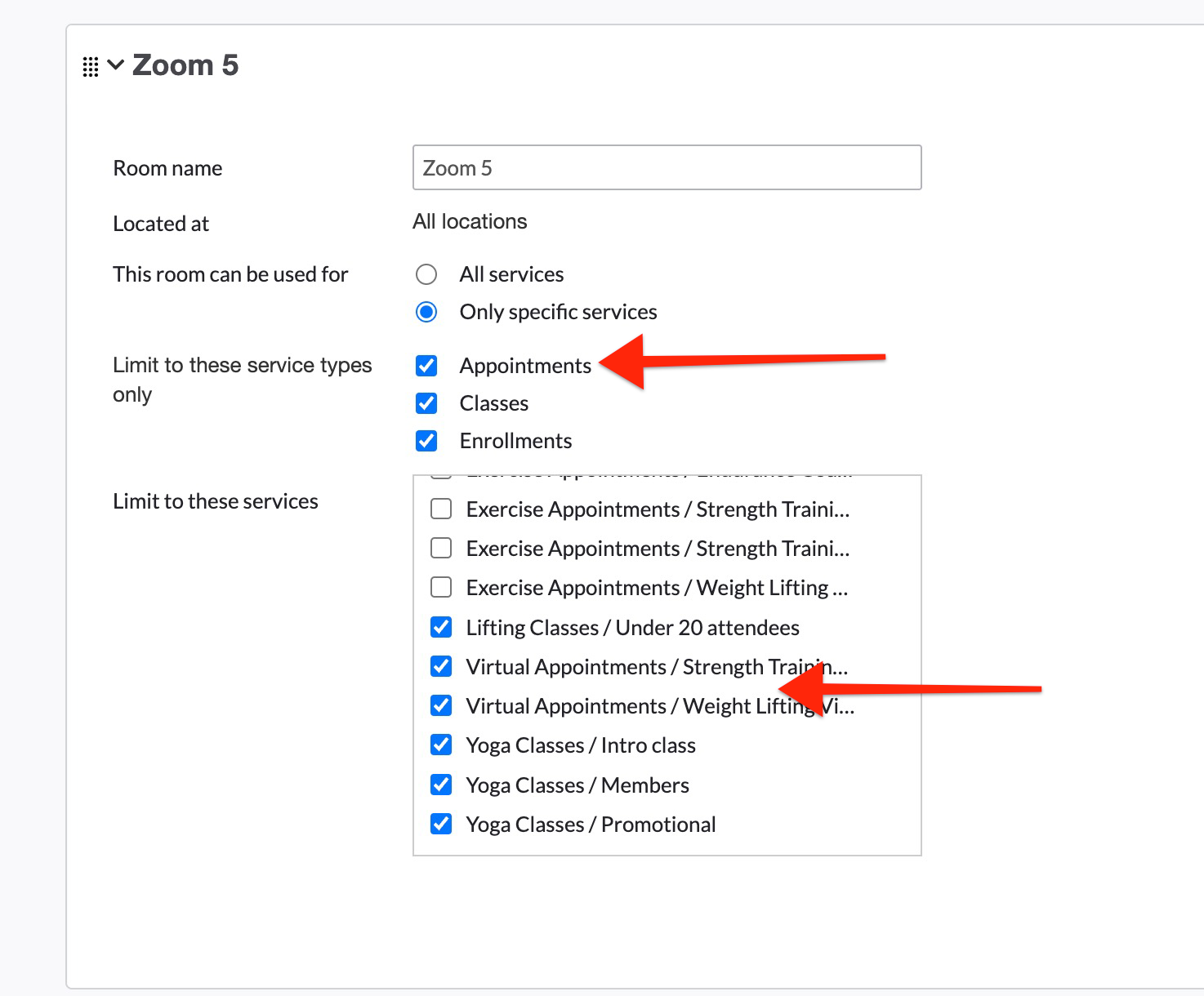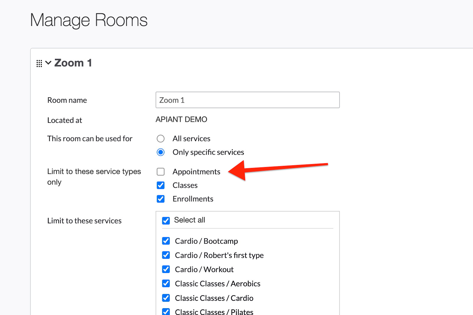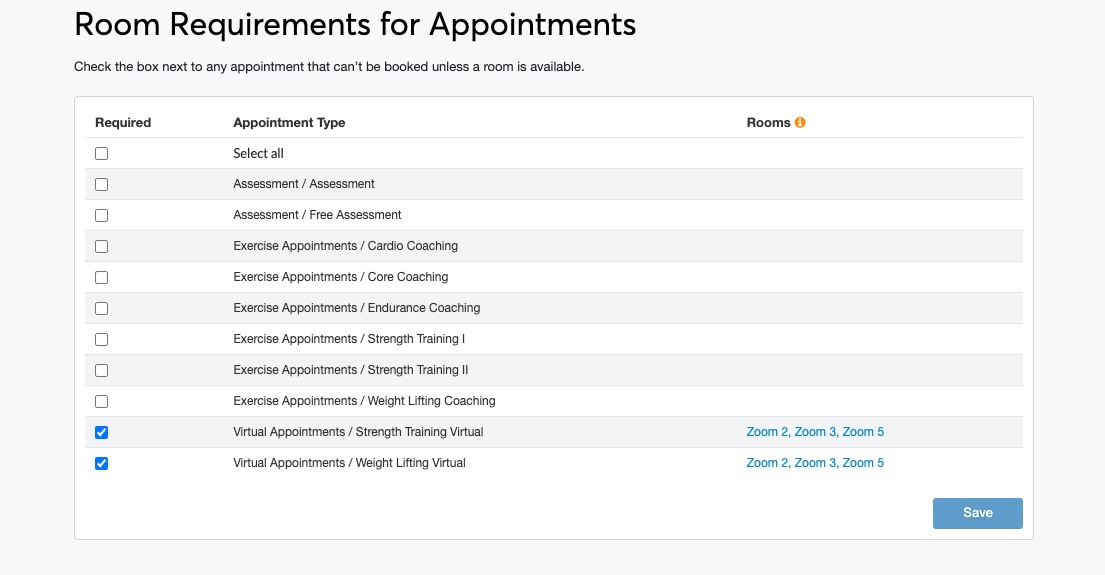 Appointment Type and Room Assignments In Mindbody, all appointment types must be assigned to the rooms being used as part of the criteria. For instance: